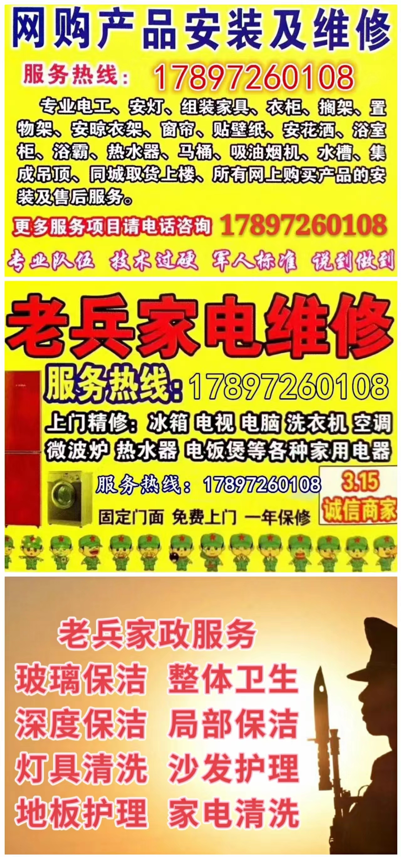 1.电器维修及安装:冰箱冰柜、电视、洗衣机、空调、热水器、微波炉、电饭煲等等